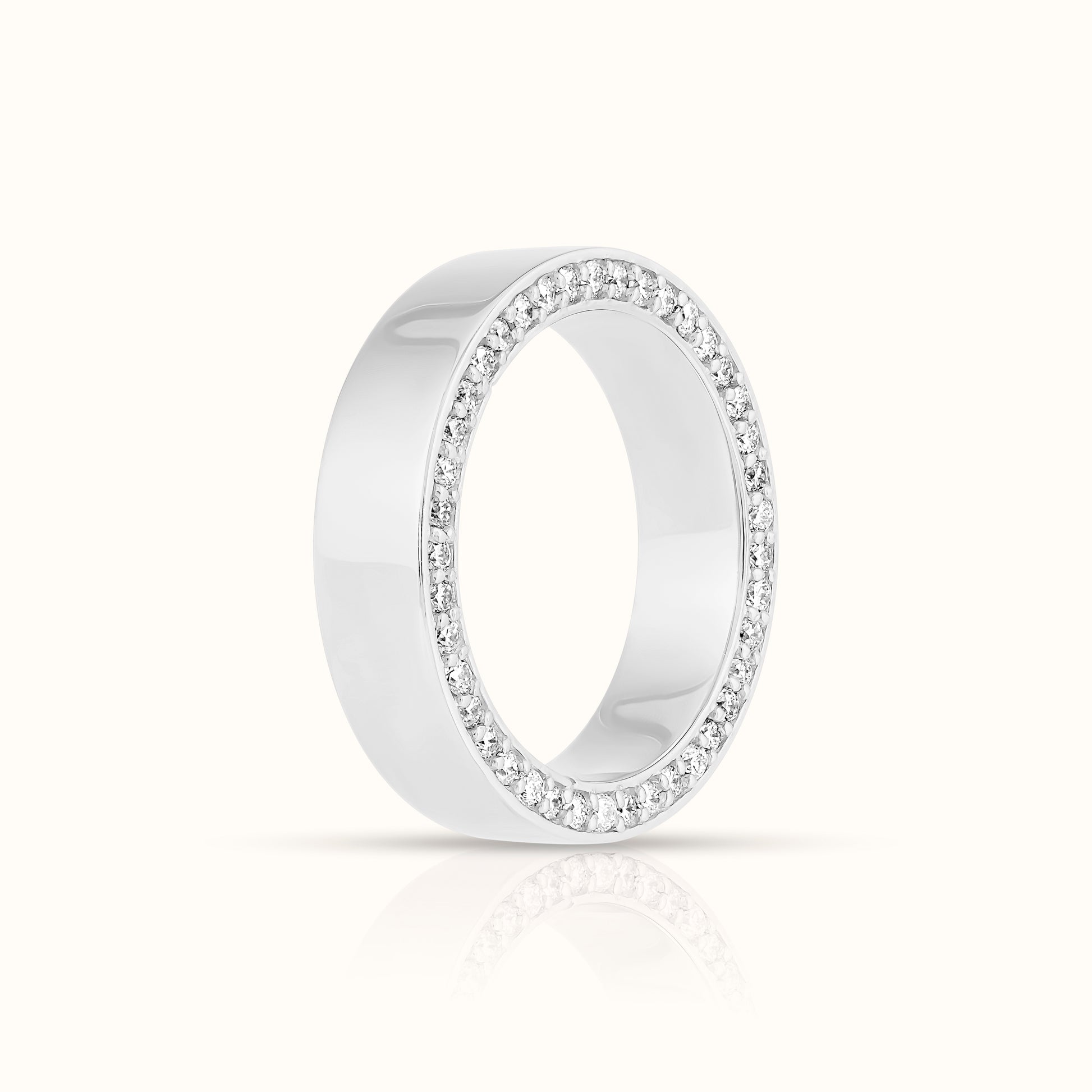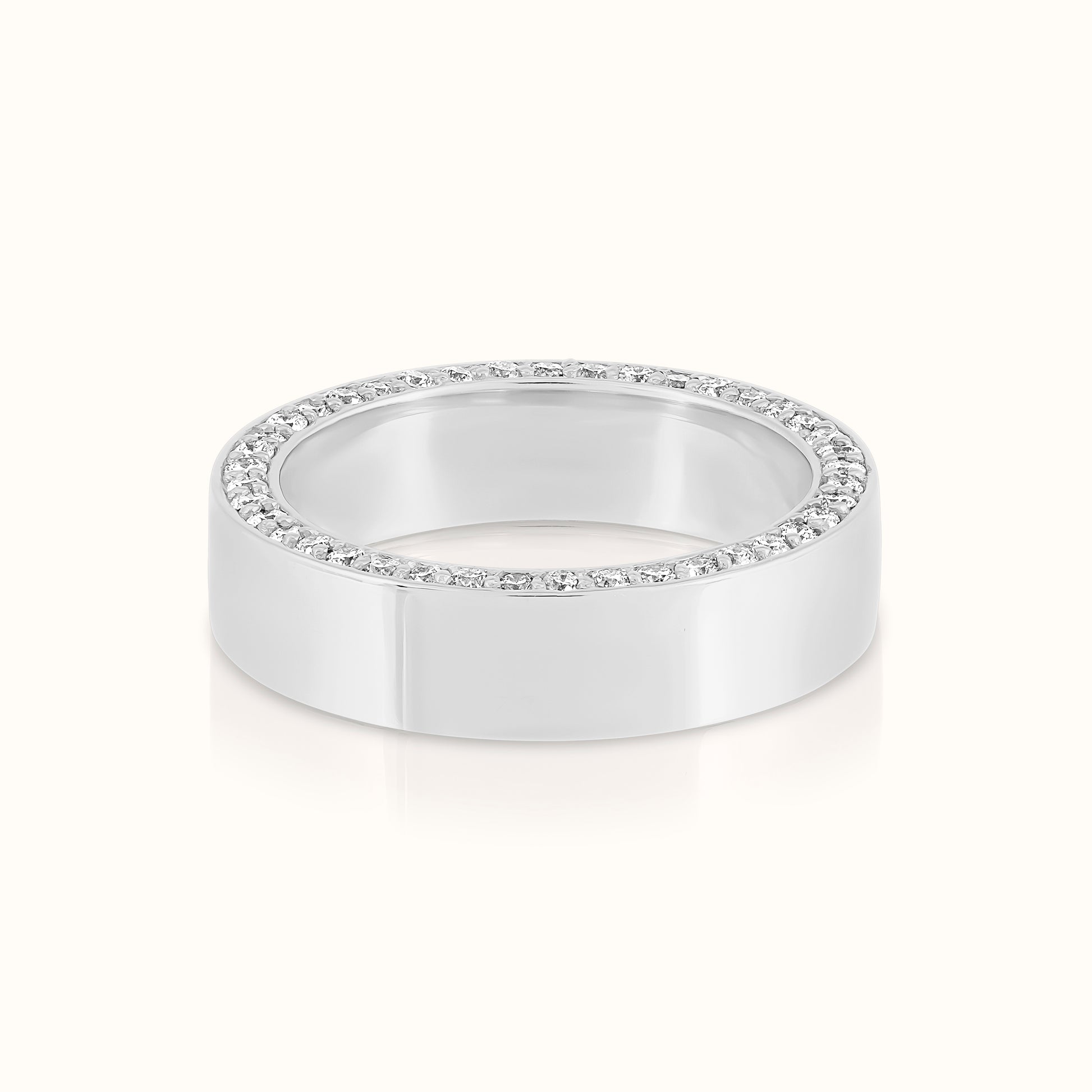 Bold yet refined, this 5MM cigar band features lab-grown diamonds set along the top and bottom edges, adding sparkle to its sleek, wide silhouette. A modern take on a classic design, it’s perfect for stacking, wearing solo, or making a signature statement.