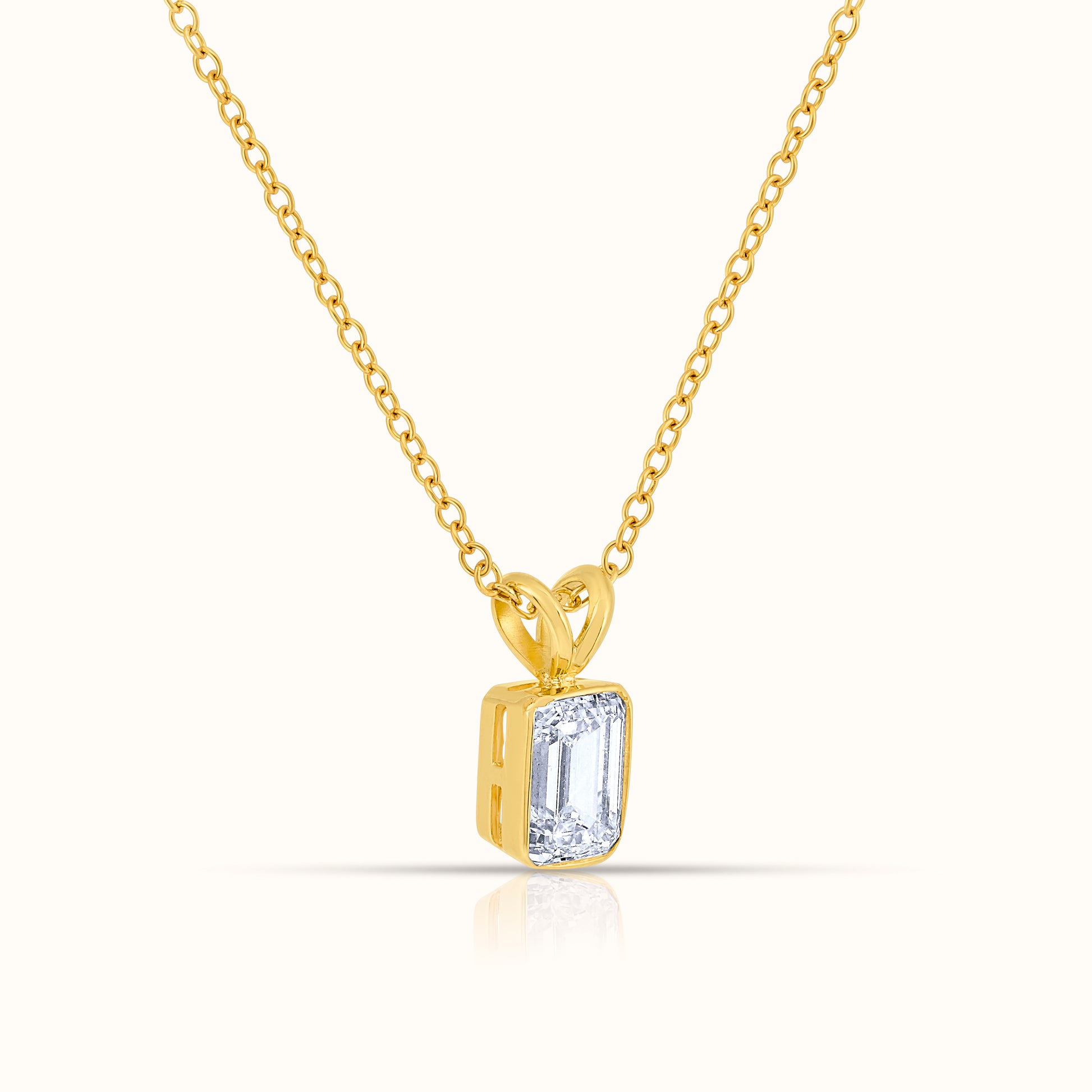 Sleek and sophisticated, this Bezel Set Emerald Cut Necklace showcases a striking emerald-cut diamond encased in a polished bezel setting. Its clean lines and timeless elegance make it a captivating centerpiece, perfect for elevating any outfit with modern refinement and effortless luxury.