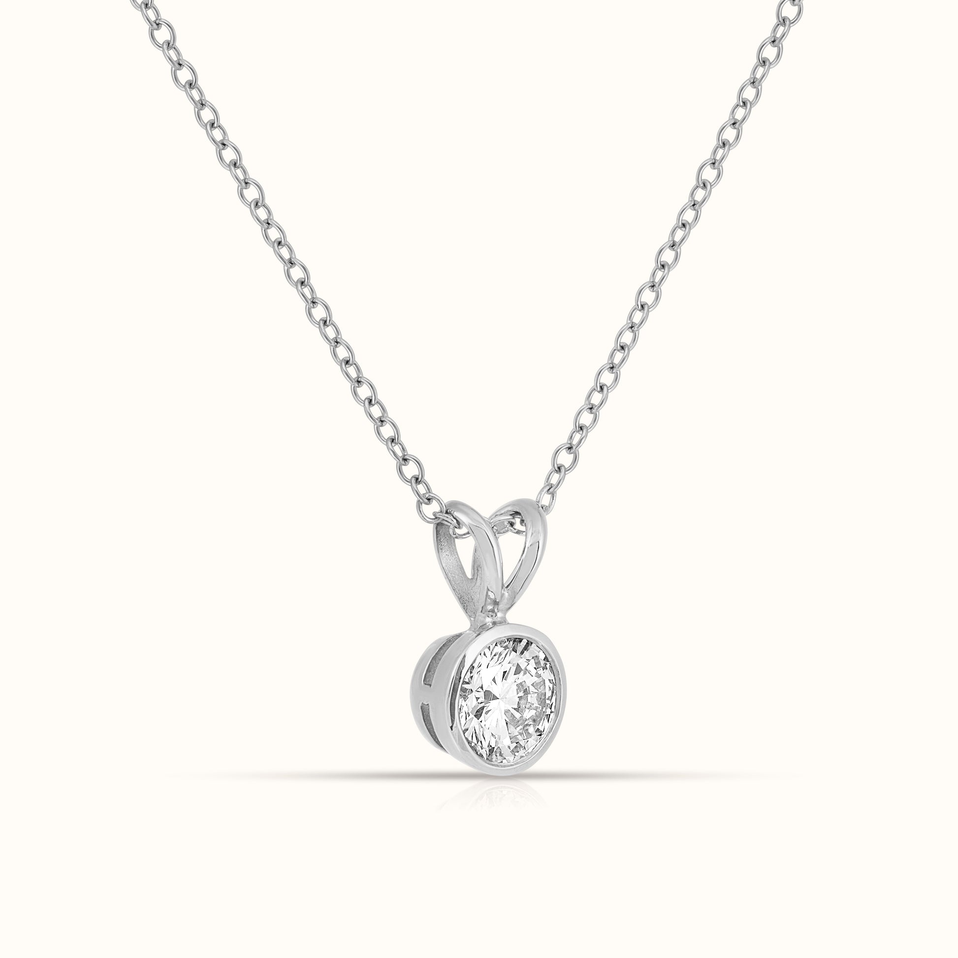 Timeless and elegant, this Bezel Set Round Cut Diamond Necklace features a brilliant round diamond encased in a sleek bezel setting. Its classic design makes it perfect for everyday wear or special occasions, offering effortless sophistication and a refined sparkle that elevates any look with enduring luxury.