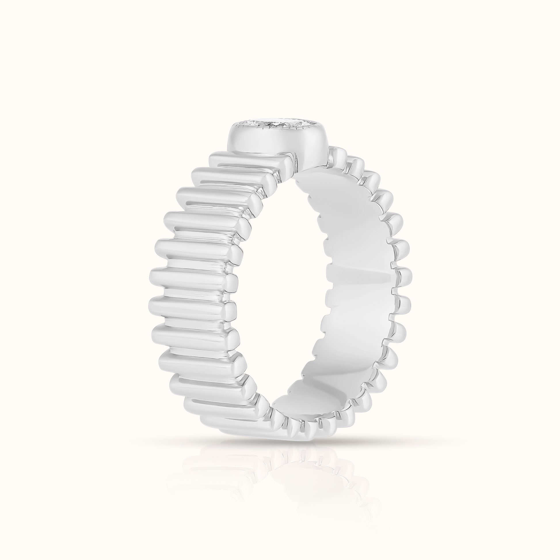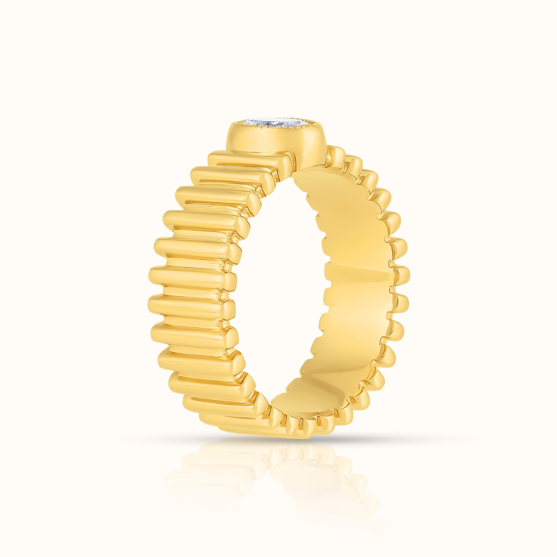A modern twist on a classic design, this fluted band features a bezel-set oval lab-grown diamond at its center, adding elegance and sparkle to the textured silhouette. The fluted details catch the light beautifully, making it perfect for stacking or wearing solo as a refined statement piece.
