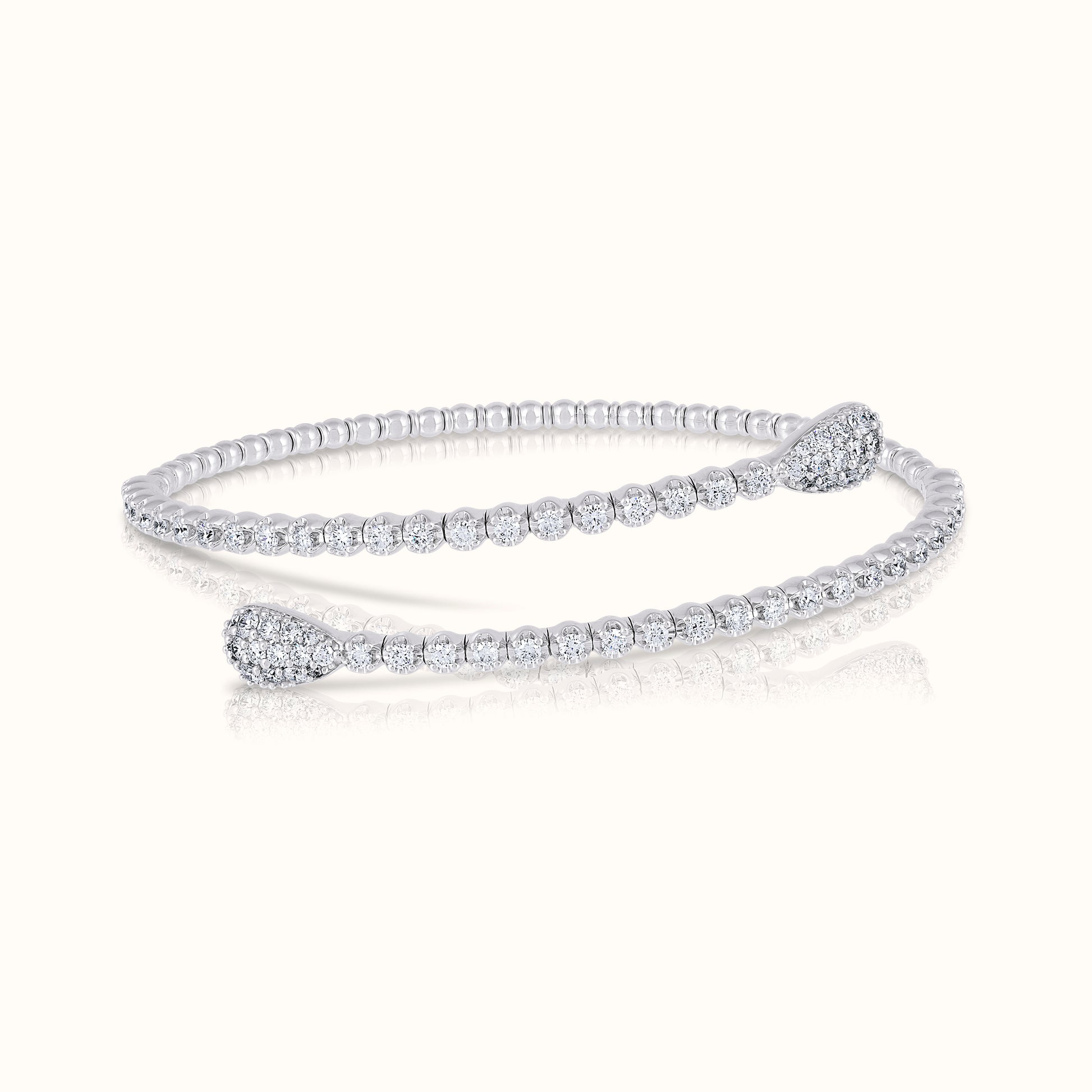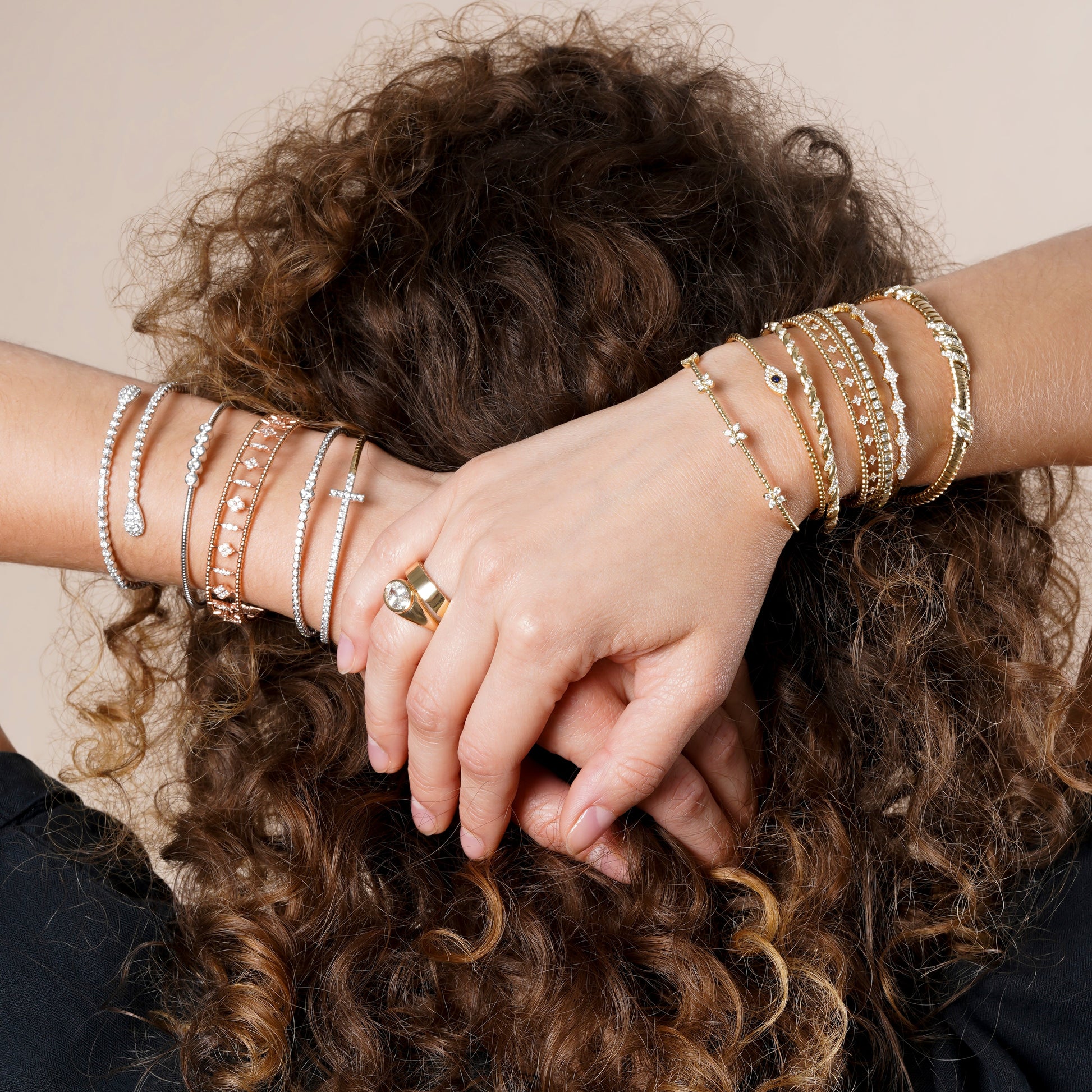 A perfect balance of romance and elegance, this cuff begins with a pear-shaped water drop diamond at the opening. Buttercup-set lab grown diamonds shimmer halfway around the bracelet, while polished solid gold beads complete the design, creating a distinctive piece that feels both timeless and modern.