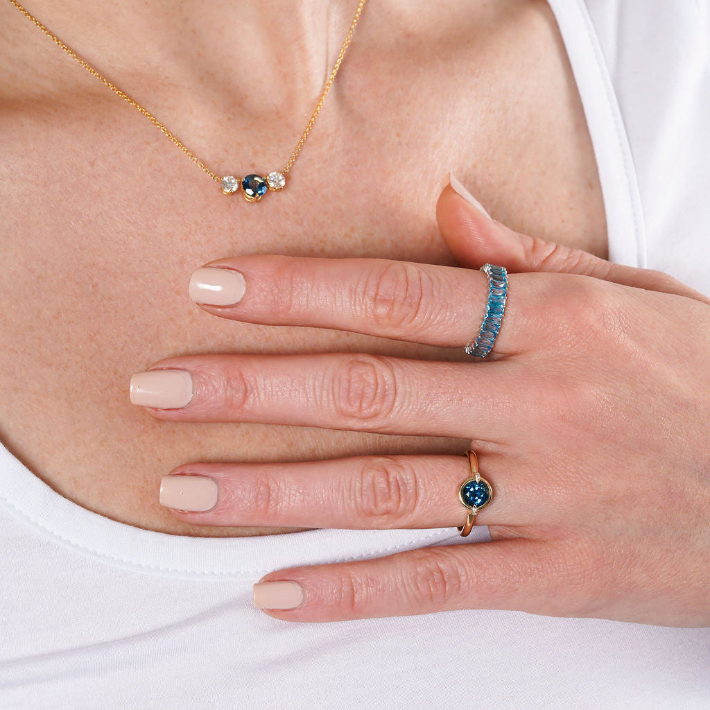 Catch every glance with this dazzling blue topaz ring. The claw-prong lab-grown diamonds add just the right sparkle, creating a look that’s playful, polished, and effortlessly wearable!