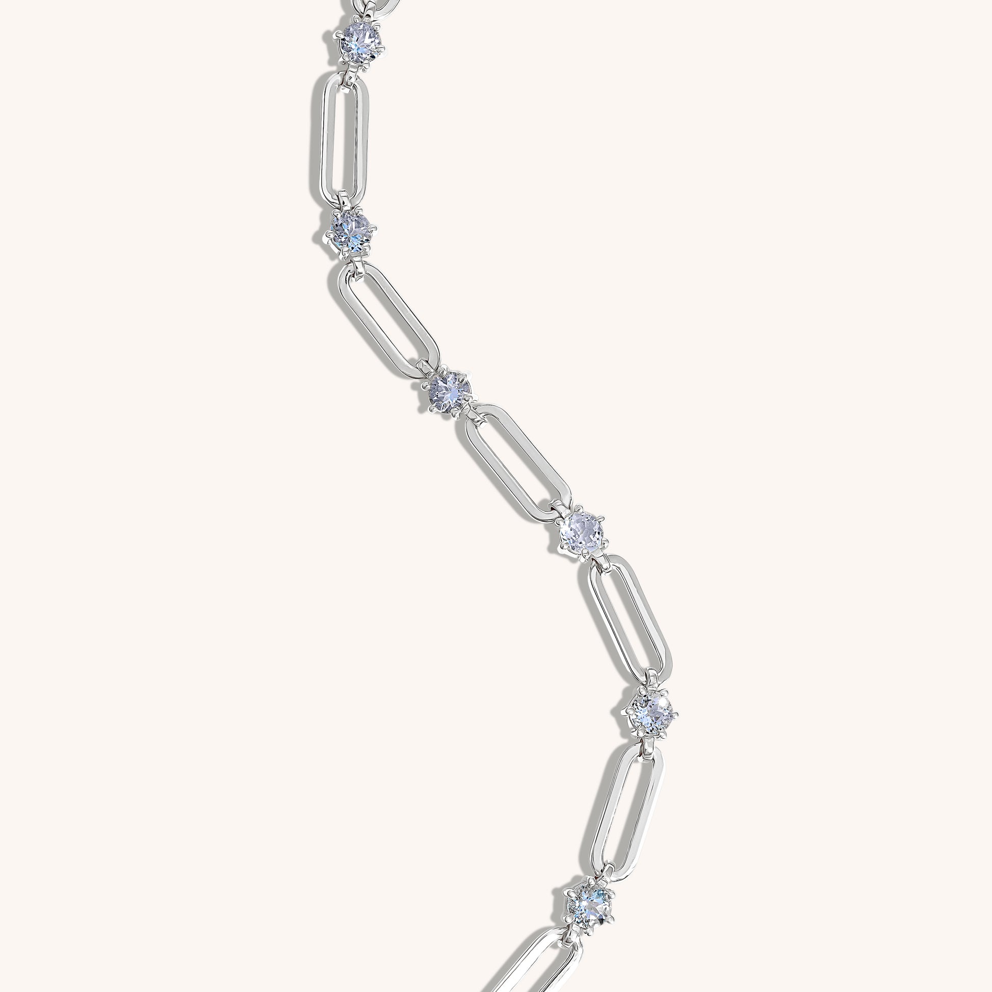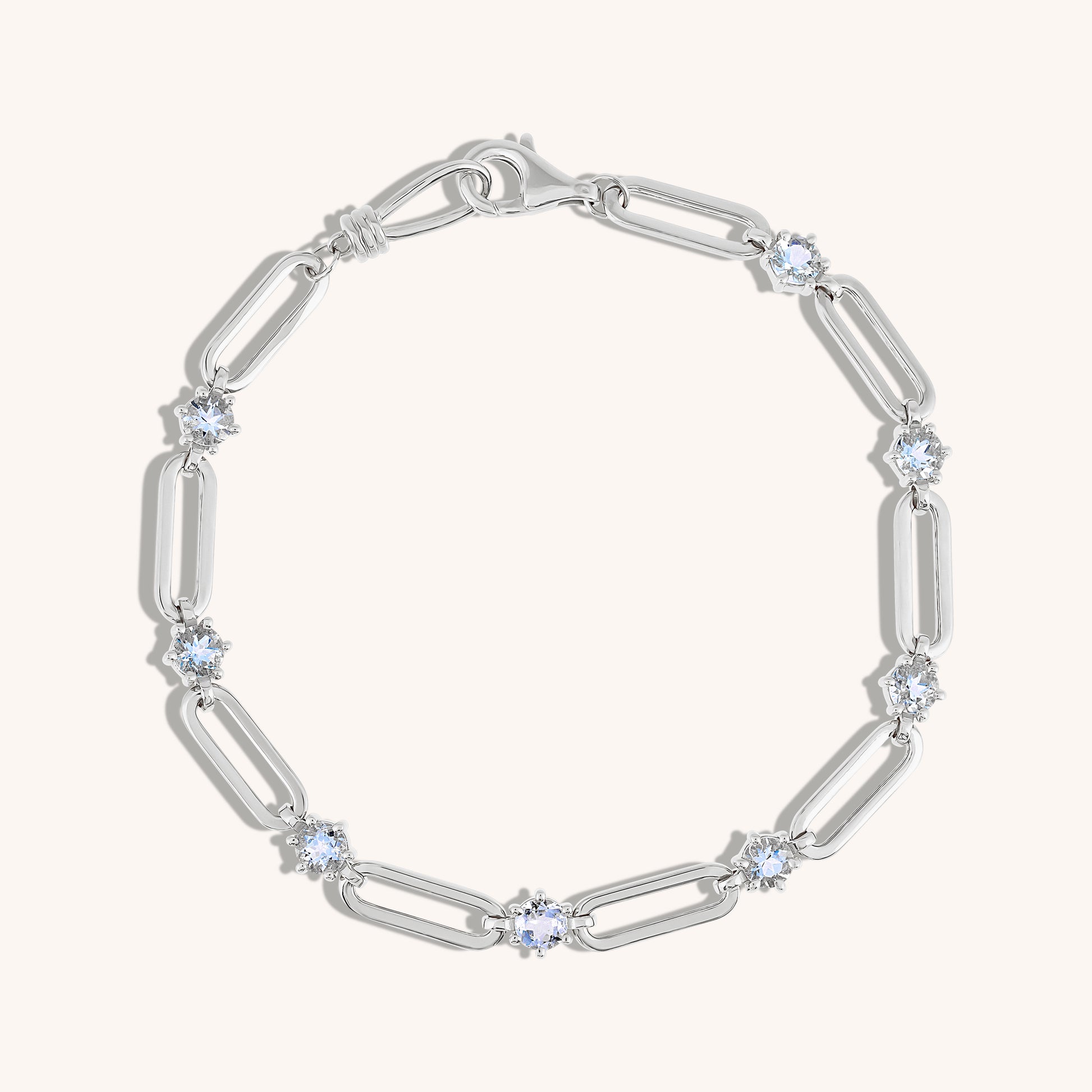 Sleek paperclip links paired with vibrant aquamarine create a modern yet effortless bracelet. It adds a fresh pop of color to your everyday look while still refined enough to stack with other favorites!