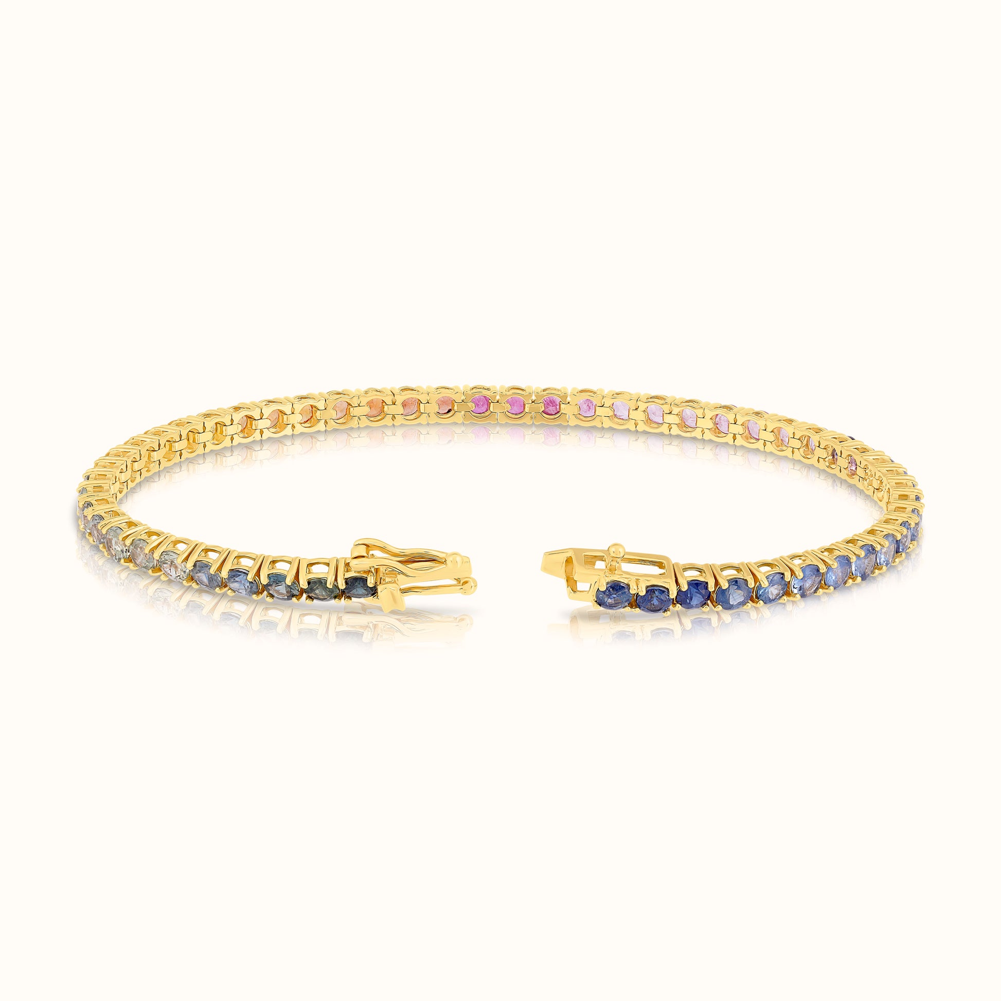 A dazzling parade of vibrant sapphires dances along this delicate tennis bracelet, capturing the full spectrum of a rainbow. Elegant yet playful, it’s the perfect piece to add a touch of color and cheer to any outfit, making a subtle statement that never goes unnoticed.